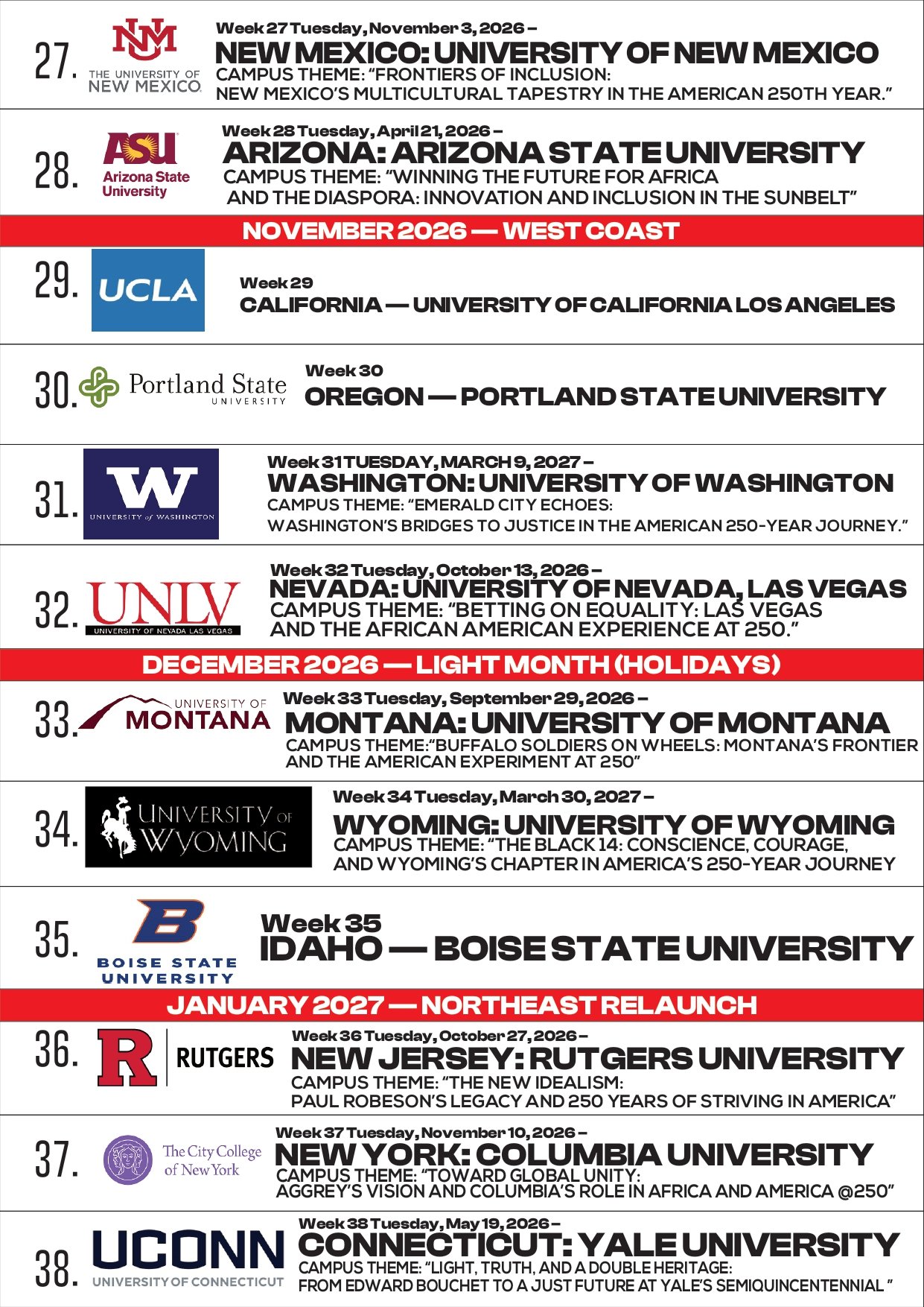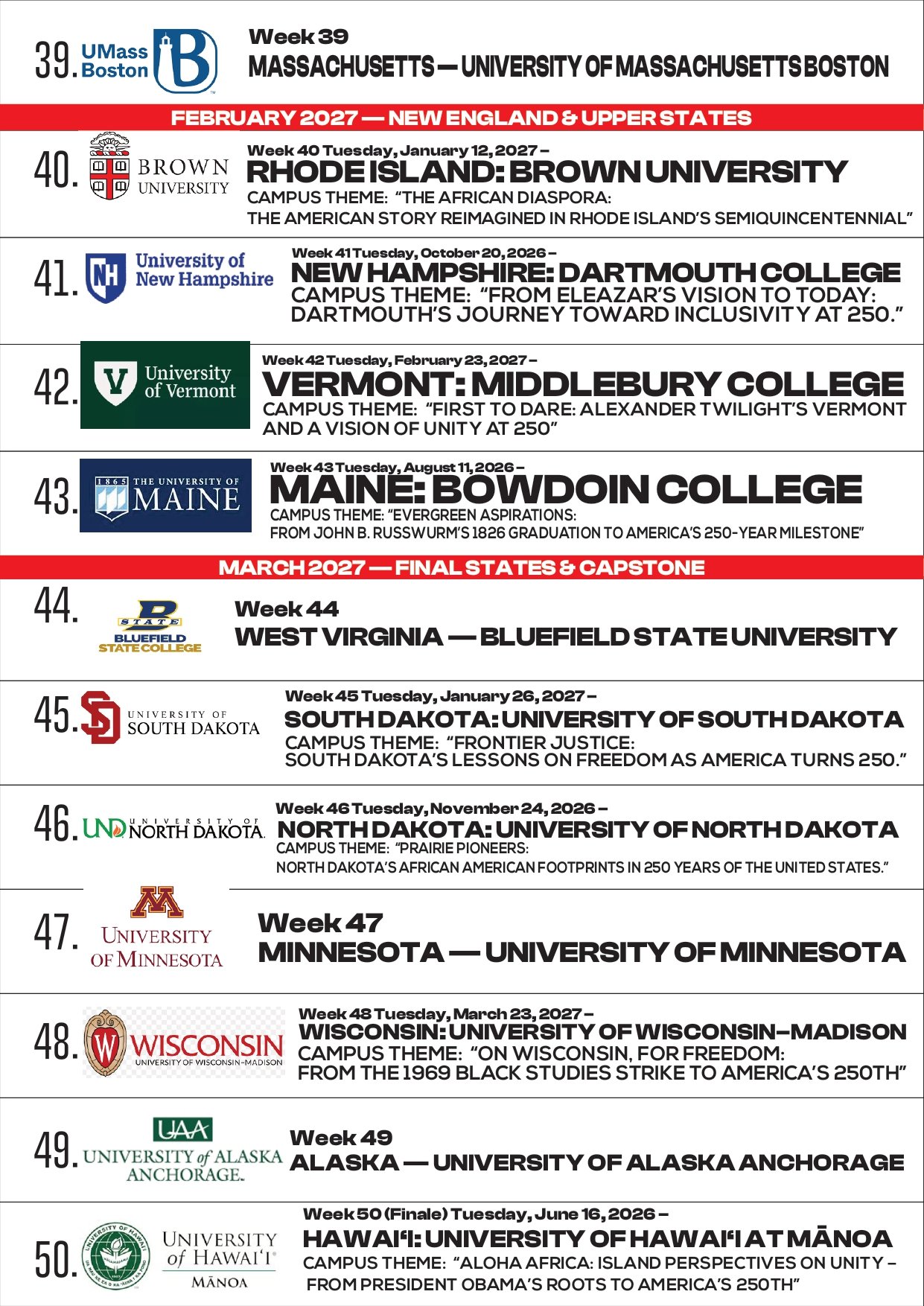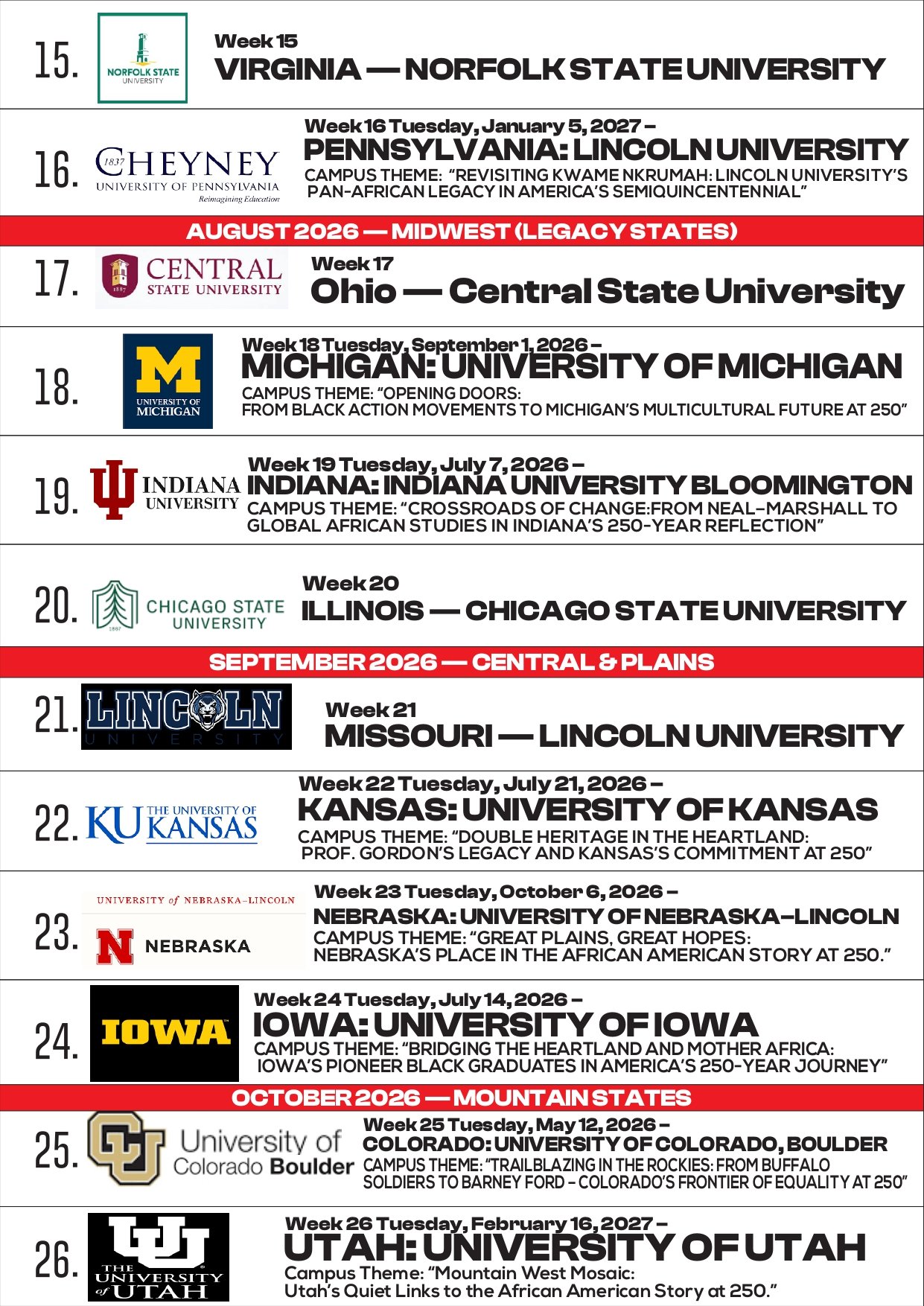 From the Deep South to the Northeast, each university on the tour will host discussions and events centered around unique themes that highlight the integral role of African and African American narratives in the making of America. This initiative fosters a national dialogue, encouraging reflection and scholarship as we approach this historic milestone.